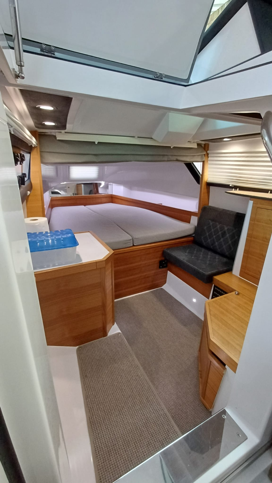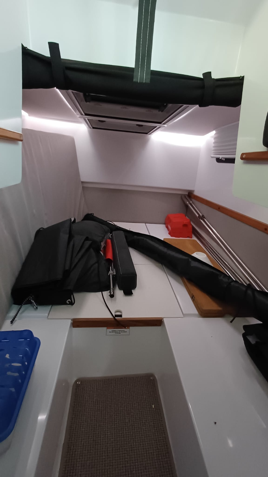 Konaklama ve Mutfak: Ön kabinde çift kişilik geniş yatak, gizli bölmeli tuvalet ve buzdolabı içeren fonksiyonel mutfak ünitesi.